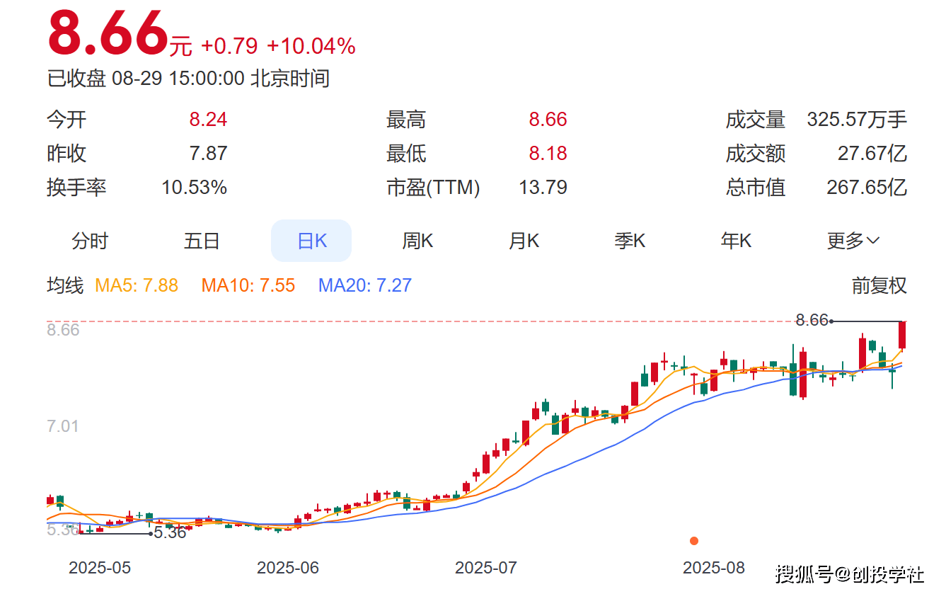 2025年8月29日,盛屯矿业股价强势涨停,收盘报8.66元,涨幅达9.91%,总市值突破267亿元。