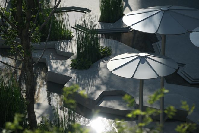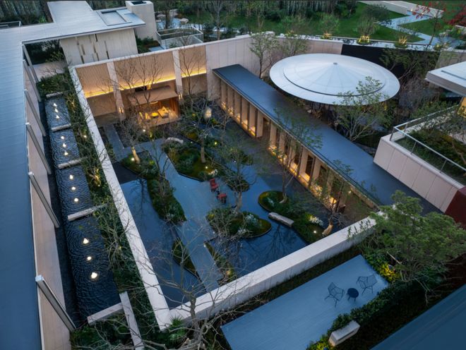 步入社区,首入眼帘的是约6米高水幕的下沉式山水庭院,与周围建筑融为一体,将自然与松弛感带给社区。